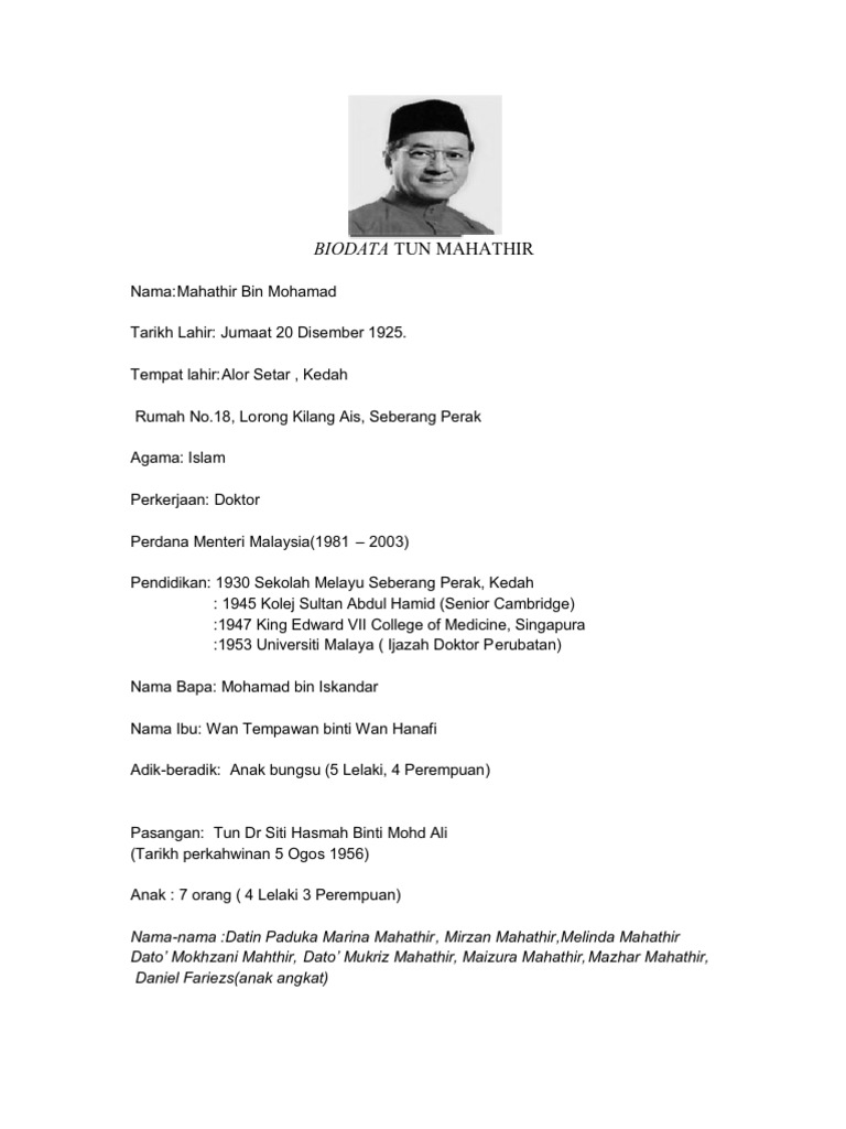 Biodata Ringkas Tun Dr Mahathir : Tun dr mahathir mohamad menegaskan, beliau tidak pernah berjumpa cif inspektor azilah hadri sejak bekas pegawai polis itu dipenjarakan atas kesalahan membunuh wanita mongolia, altantuya shaariibuu.. Savesave biodata ringkas tun dr mahathir for later. Hasil perkahwinan dan perkongsian hidup tun dr. Ariff confirmed the authenticity of the letter sent. Tun dr mahathir bin mohamed's real name is mahathir s/o iskandar kutty. Mahathir mohamad putrajaya, malaysia prime minister of malaysia (1981.