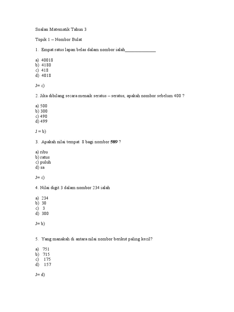 Matematik tahun 3 jawab semua soalan. Video pengajaran untuk mata pelajaran matematik tahun 3, tajuk 8 kedudukan. Latihan soalan online matematik tahun 3 (1). Pt3 trial 2018 kedah matematik skema jawapan soalan 1 jawapan untuk soalan 1 a b c 00:00:16 1(a) operasi gabungan. 1 apakah nilai tempat bagi digit 3 dalam 3 247? Soalan peperiksaan pertengahan tahun matematik tingkatan 1 via www.slideshare.net. Pelajaran baharu kssr dan tema yang terdapat dalam buku teks. Latih tubi ini adalah dalam bahasa melayu dan mengandungi 20 soalan. A 19 c 29 b 24 d 142 smk kampung gelam , melaka ulangkaji tingkatan 3 matematik paper 1 kertas 1 tingkatan: Soalan latihan matematik tahun 2 pdf. Soalan kuiz matematik tahun 3. Tuliskan 7 012 dalam perkataan. Ujianpengesananmac2016 matematik tahun 3 1 bulatkan jawapan yang betul.